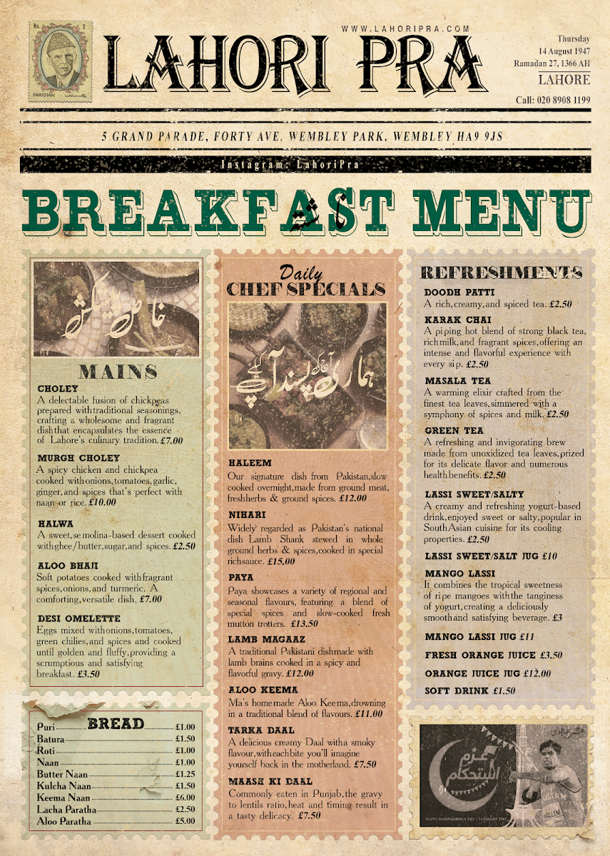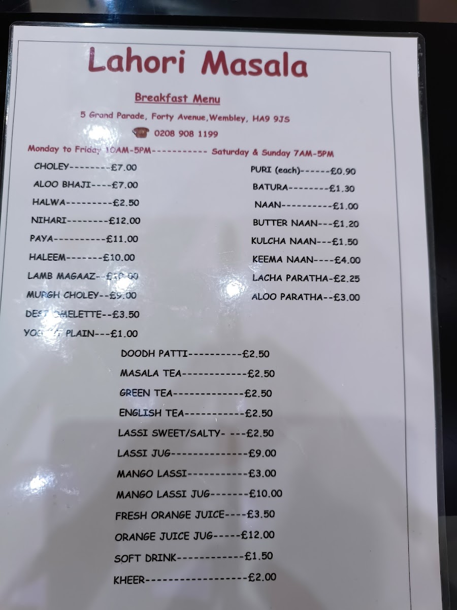 Upon entering, you'll be greeted by a warm and inviting atmosphere, enhanced by the charm of its passionate staff. The care that they put into their service is evident from the very first interaction, creating a welcoming environment that feels like home. With a tantalizing breakfast menu that includes delights such as Nihari (£15), Halwa (£3.00), and Aloo Paratha (£5.00), you’re sure to find something that hits the spot.